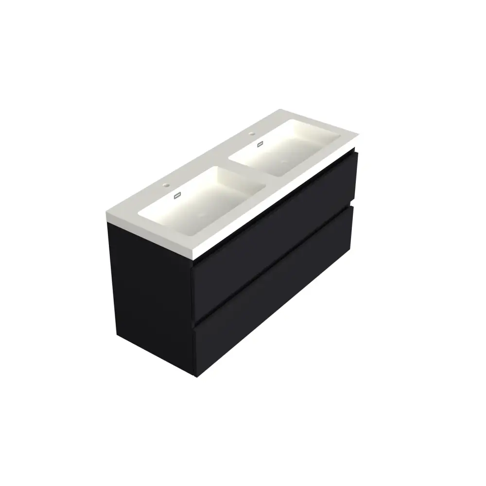 Deze onderkast van 120x46cm in mat zwart is perfect voor dubbele wastafels met een strakke uitstraling. Voorzien van twee brede softclose-lades die ruim en geruisloos openen. De mat zwarte afwerking maakt het meubel tijdloos en stijlvol. Gemaakt van vochtbestendige materialen voor langdurig gebruik. Het design is minimalistisch, maar uiterst praktisch. Geschikt voor zowel gezinnen als designliefhebbers. Combineer met een bijpassend topblad voor een strak totaalbeeld. -Material: Fsc gekeurd -Bevestiging: Camar ophanging Type 807 -Rails: Grass DWX soft close met stabilisators Let op: Zonder topblad, wastafel of waskom