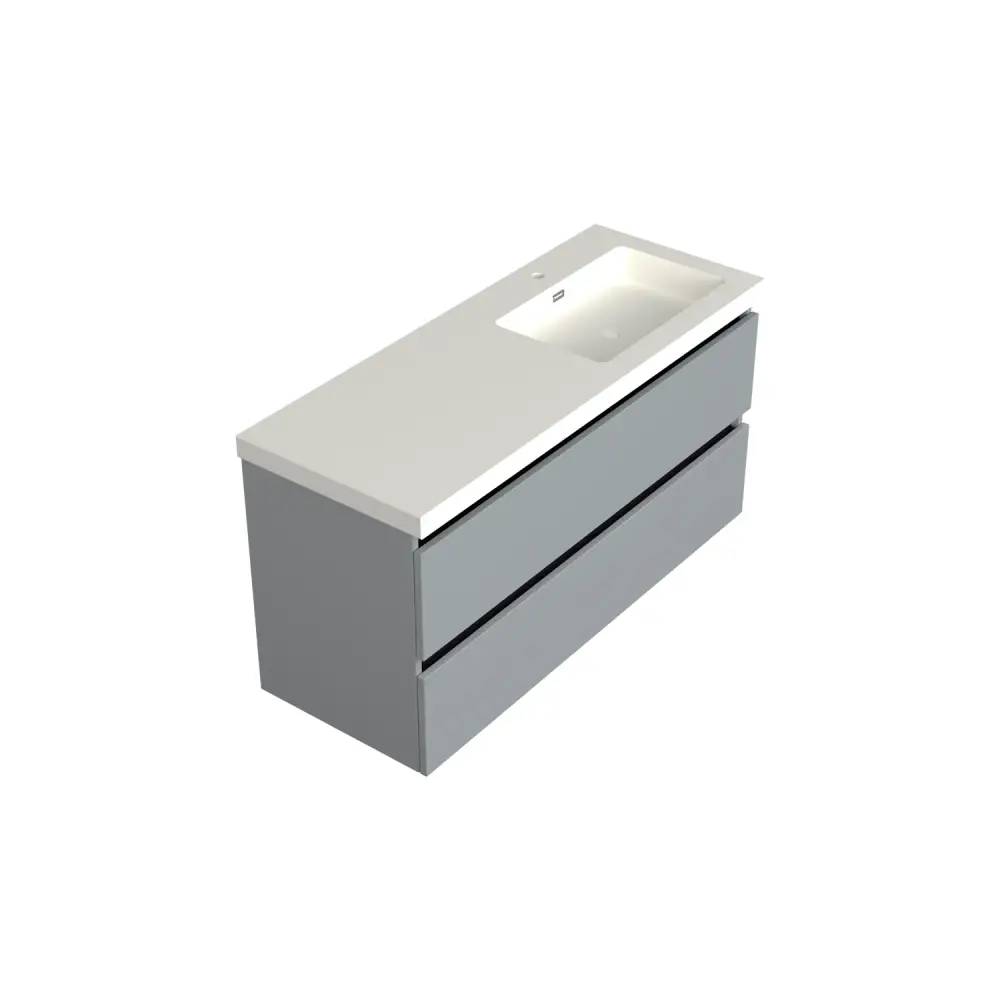 Deze Dutchline onderkast van 120x46cm met kraanuitsparing rechts is perfect voor asymmetrische wastafelopstellingen. De 2 softclose-lades bieden ruime opbergruimte. De matte grijze afwerking straalt rust en moderniteit uit. Gemaakt van vochtbestendig materiaal voor duurzaam gebruik. Geschikt voor badkamers met een praktische indeling. Combineer met een bijpassende top voor een complete look. Functioneel én stijlvol. Let op: Word meegeleverd zonder wastafel.